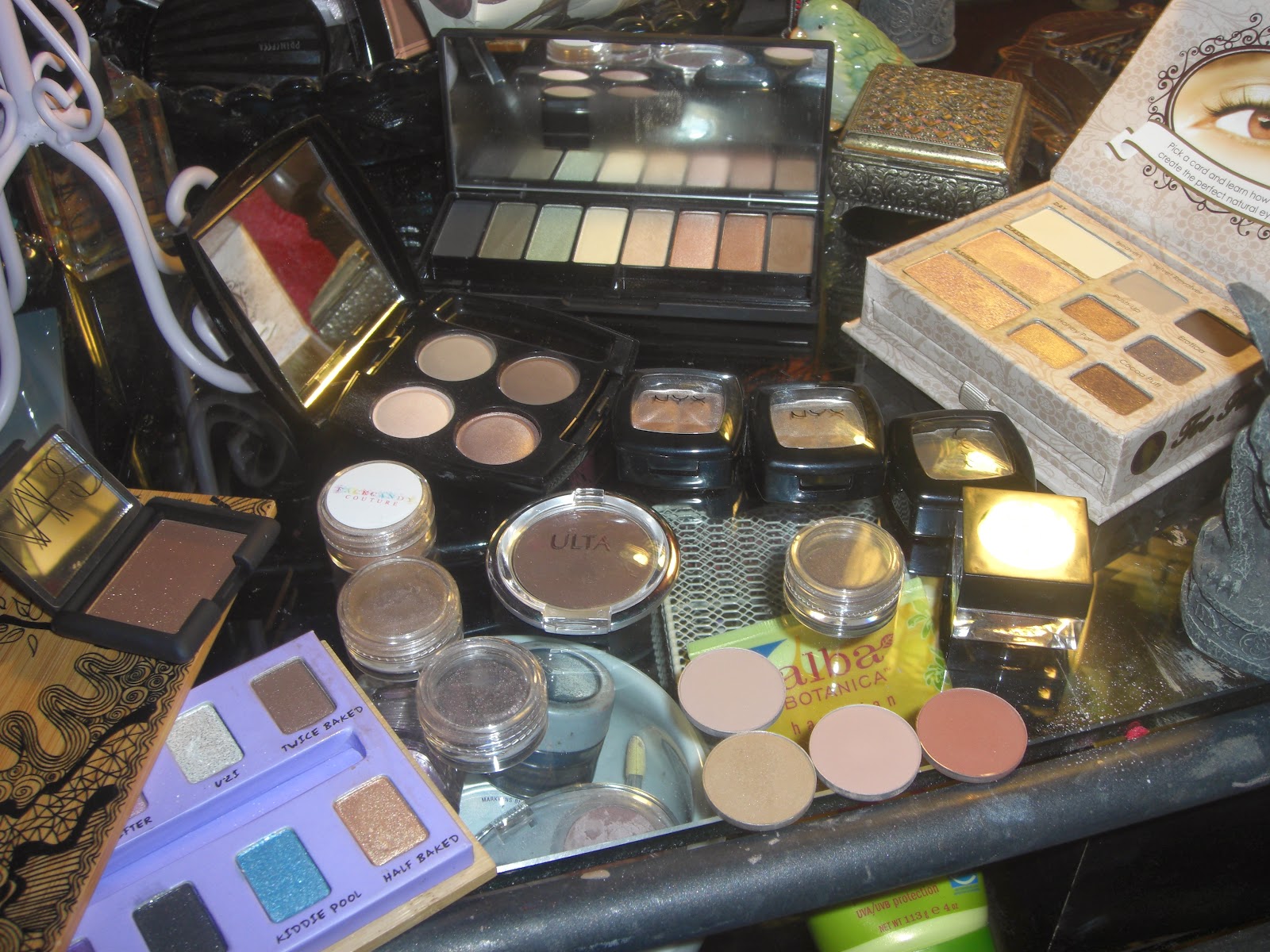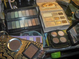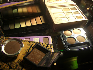 Clockwise, Kat Von D (last shadow) Leather (matte medium dark brown), Too Faced natural eye (last row, top to bottom) Sexpresso (matte dark brown), Erotica (dark brown with gold shimmer. SUPER sexy), and Cocoa Puff (chocolate brown with gold shimmer). Avon Mocha latte quad (shimmery beige, light matte brown taupe, shimmery medium golden brown, and matte chocolate brown. Really love this quad, the quality is fab! Pigmented, doesn't crease at all, and lasts all day. Not to mention the colors are gorg) . NARS Galapagos (chocolate brown with very very fine gold and subtle green glitter. HOT.) , ULTA Mink (medium chocolate brown with bronze brown shimmer. This one is my fav for a smokey eye), and Urban Decay Twice baked (shimmery medium dark brown). |
