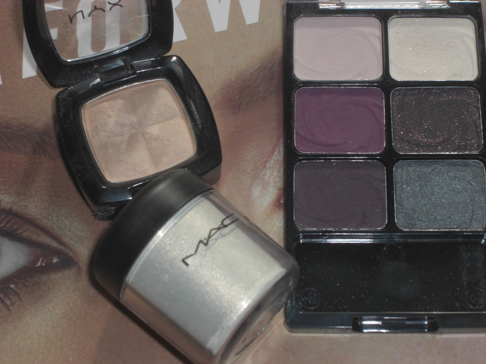 | NYX Skin, MAC Vanilla pigment, WnW Lust palette (the ivory shade), Kat Von D duo in Confessional, and Kat Von D Ludwig palette (middle shades in Clay and Tequila). |