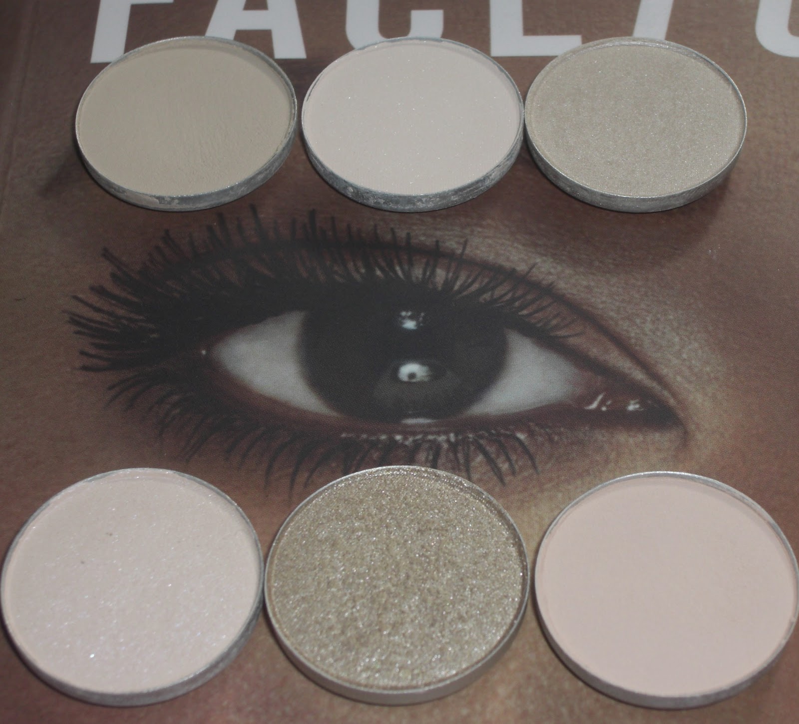 | With flash. Brule is a semi matte skin colored neutral shade. Vanilla is neutral/ivory/skin colored with very very fine silver glitter. Shroom is a neutral white with shimmer. Vapour is an AMAZING neutral pink with pearlesent pink and violet shimmer. Retrospeck is muted shimmery gold with silver glitter. Orb is a semi matte neutral/beige (perfect for when the rest of your shadow is very shimmery and you don't want to over do it). |