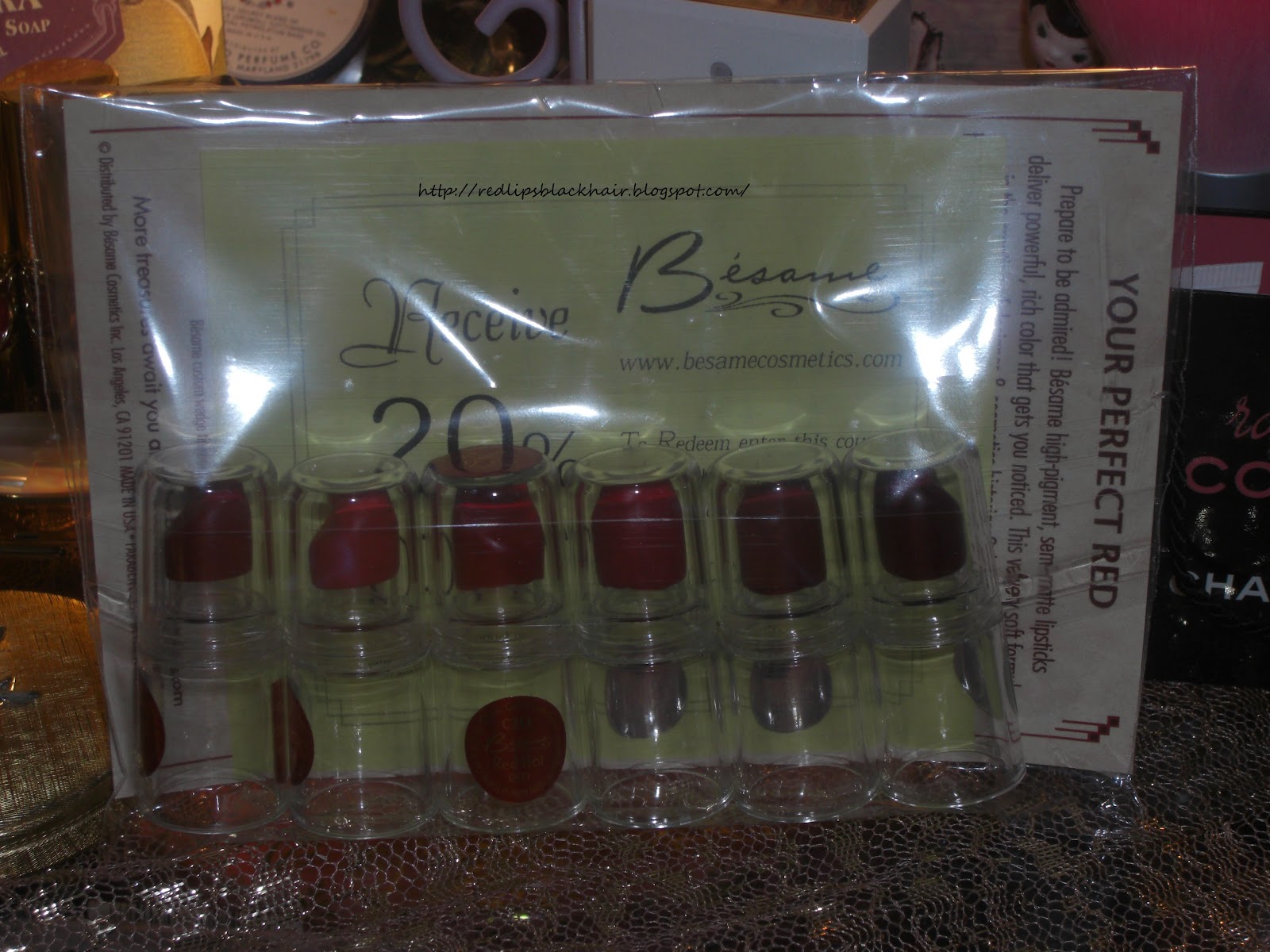 Ladies, ladies, ladies. I have the most delicious package to share with you. WAIT, that sounded wrong.. o_O I got the prettiest package in the mail today! If my lovely post office hadn't held it for a couple days I would have had this up sooner for you. But here it is! Six samples of their reds (for $8.00, full sizes are $22.00)! Dream come true for Sonia! According to the site it's enough product for 4 applications. Colors it came with are Red Velvet, Carmine, Red Hot Red, Besame Red, Merlot, and Cherry Red. Came with a gorgeous post card that has descriptions of all of them on the back and with a 20% off coupon. It was for a limited time, very limited I guess cause now I can't find it anywhere to link it. :((( Here's how they came packaged: