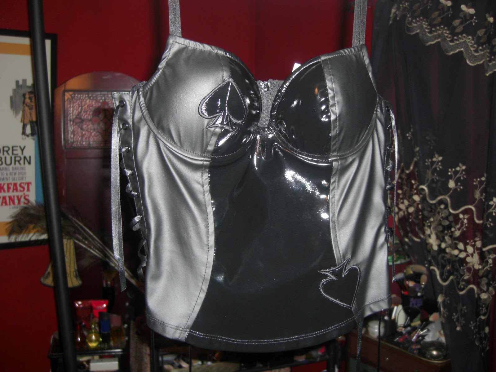 Lace and satin Fredricks of Hollywood "corset". Not really a corset as it doesn't have actual boning. Size 36 bust. But the actual size is like a large. Worn twice for clubbing. $25 shipped.